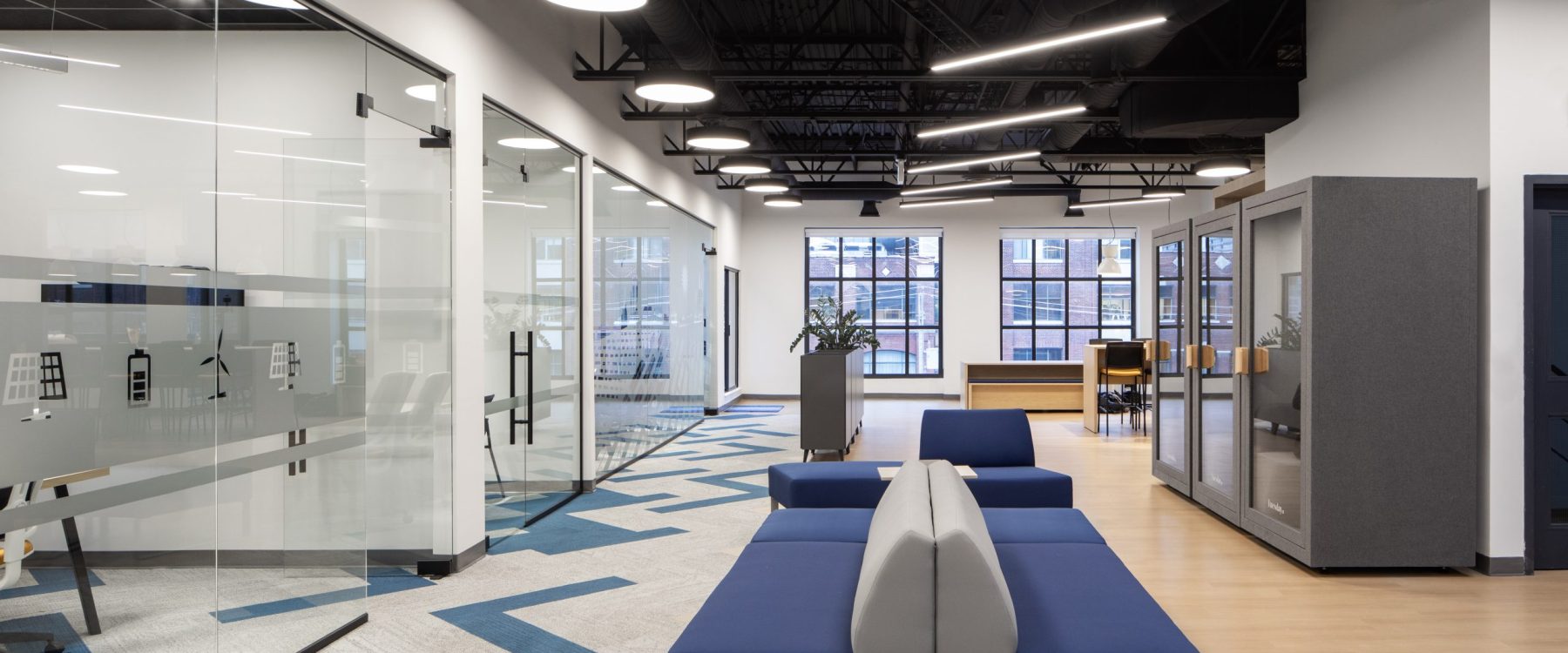 A spacious open-concept environment anchored by custom workstation layouts, integrated acoustic elements, and a bold blue-and-grey patterned carpet that visually guides circulation throughout the space.