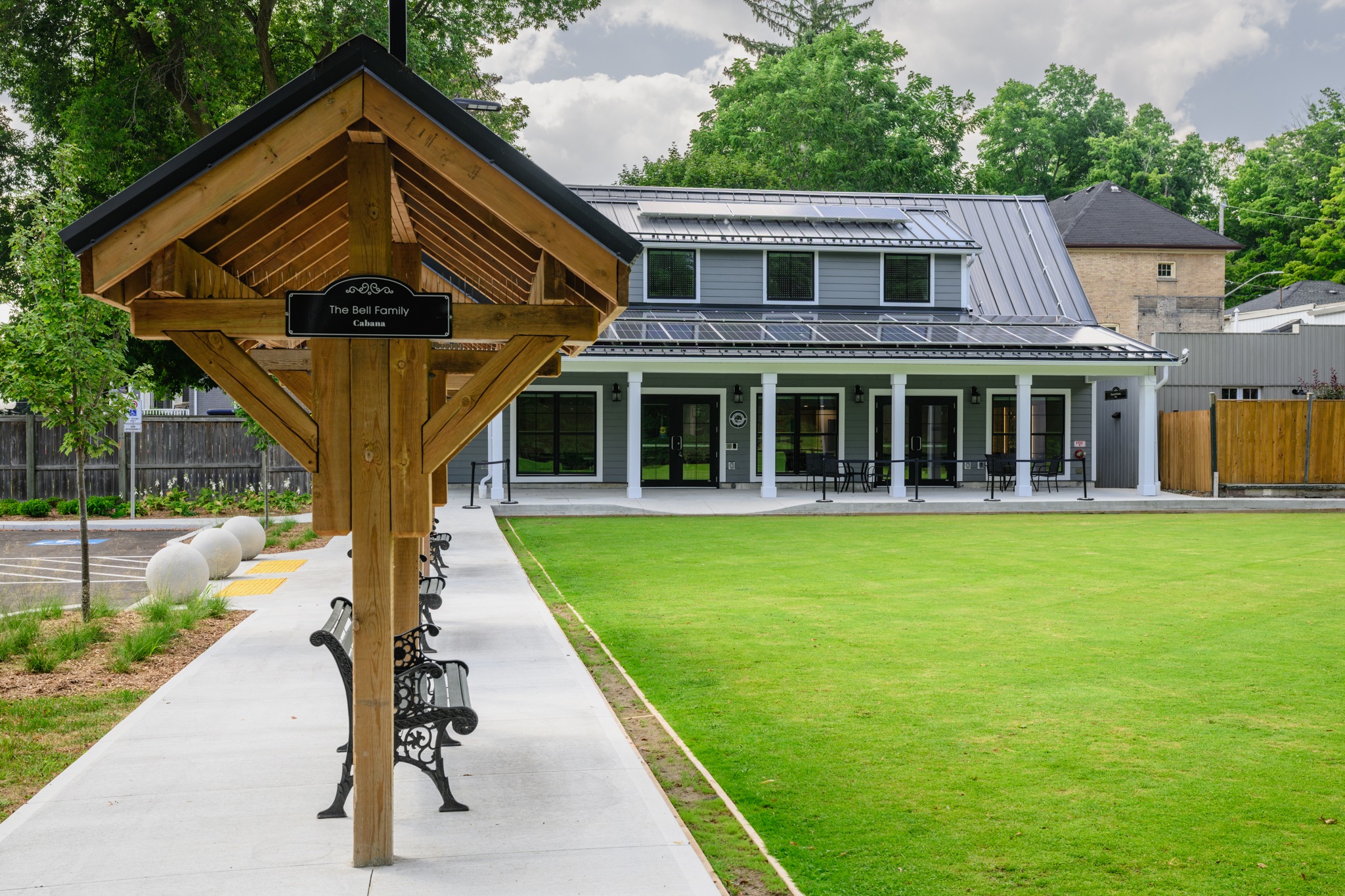 - Shaded Seating Areas – Custom-built wooden pergolas with benches offer comfortable shaded areas for relaxation and social interaction.